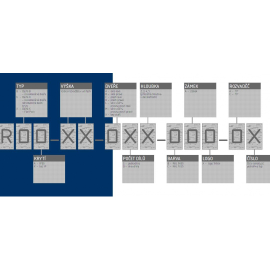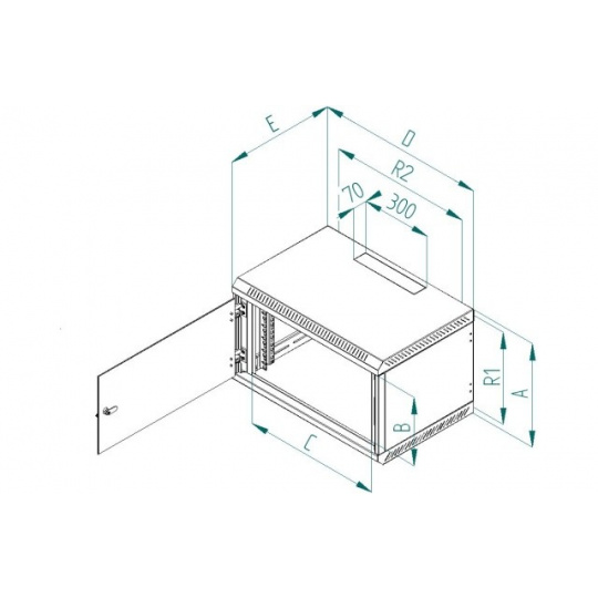 Presné rozmery a ďalšie technické údaje sú uvedené nižšie (hodnoty R1 a R2 označujú vzdialenosť montážnych otvorov na zavesenie rozvádzača na stenu).
