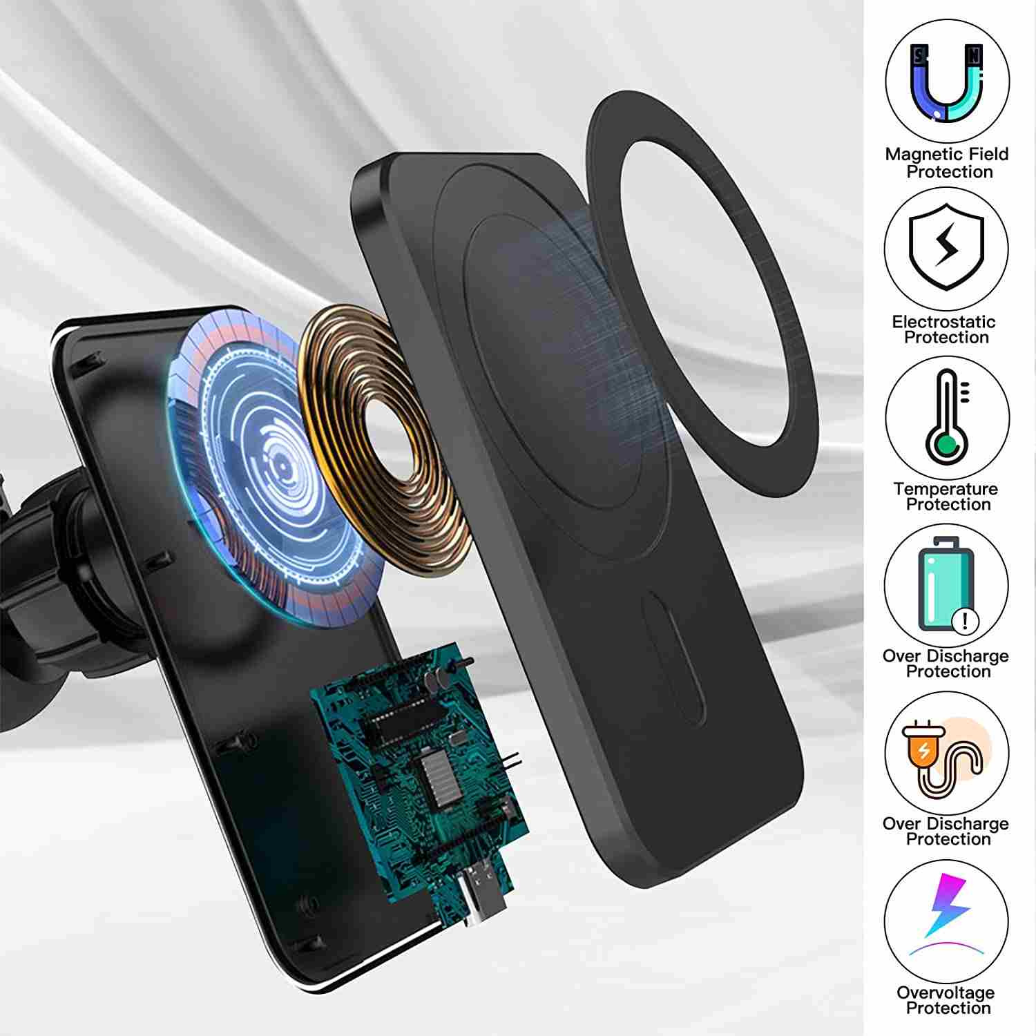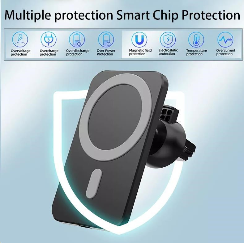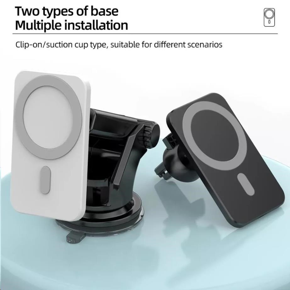 Vysoko kvalitná výkonná bezdrôtová magnetická nabíjačka do auta s podporou Apple MagSafe. Vybavená dvoma držiakmi, môžete zvoliť buď variant do ventilácie, alebo otočný a vysúvací držiak s prísavkou.
