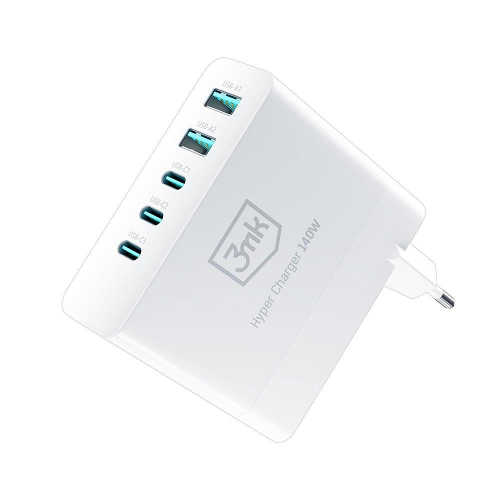 3mk síťová nabíječka - Hyper Charger 140W, GaN 3x USB-C (PD) / 2x USB, bílá