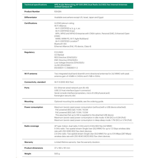 Odkaz na web výrobcu: https://www.arubanetworks.com/assets/ds/DS_AP500Series.pdf