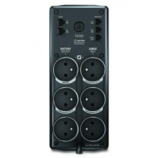 | Typ zásuviek | RJ-11 In/Out RJ45 Base-T Ethernet (3) francúzsky/belgický (výstup - záložná prevádzka na batérie) (3) francúzsky/belgický (výstup - prepäťová ochrana) na ochranu laserových tlačiarní, skenerov alebo iných zariadení s vysokým výkonom |