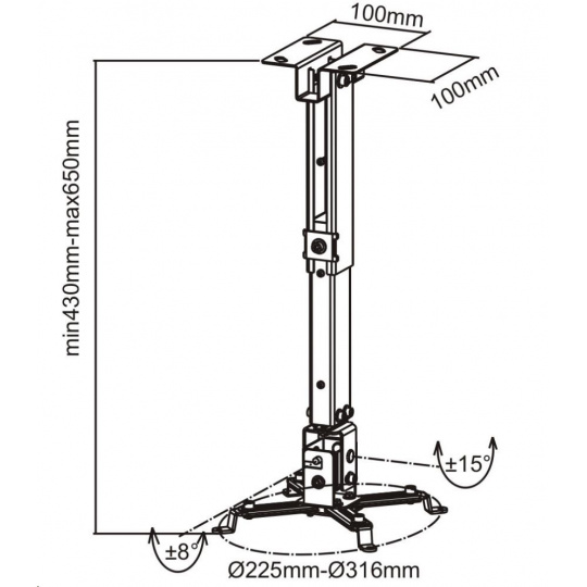 Všeobecný držiak na montáž projektora na strop - farba: sivá - naklápanie: ±30° - ľahká a rýchla montáž - vrátane skrutiek a hmoždiniek - vzdialenosť projektora od stropu nastaviteľná: 43-65 cm - nosnosť: 20 kg
