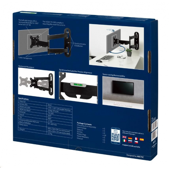 Nástenný držiak na monitor ARCTIC W1C bez problémov podporuje najnovšie ultraširokouhlé monitory (do 49 palcov). Kompatibilné sú aj klasické monitory s pomerom strán 16:9 (do 43 palcov). W1C unesie celkovú záťaž 18 kg/39.6 libier.