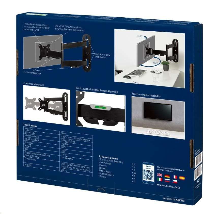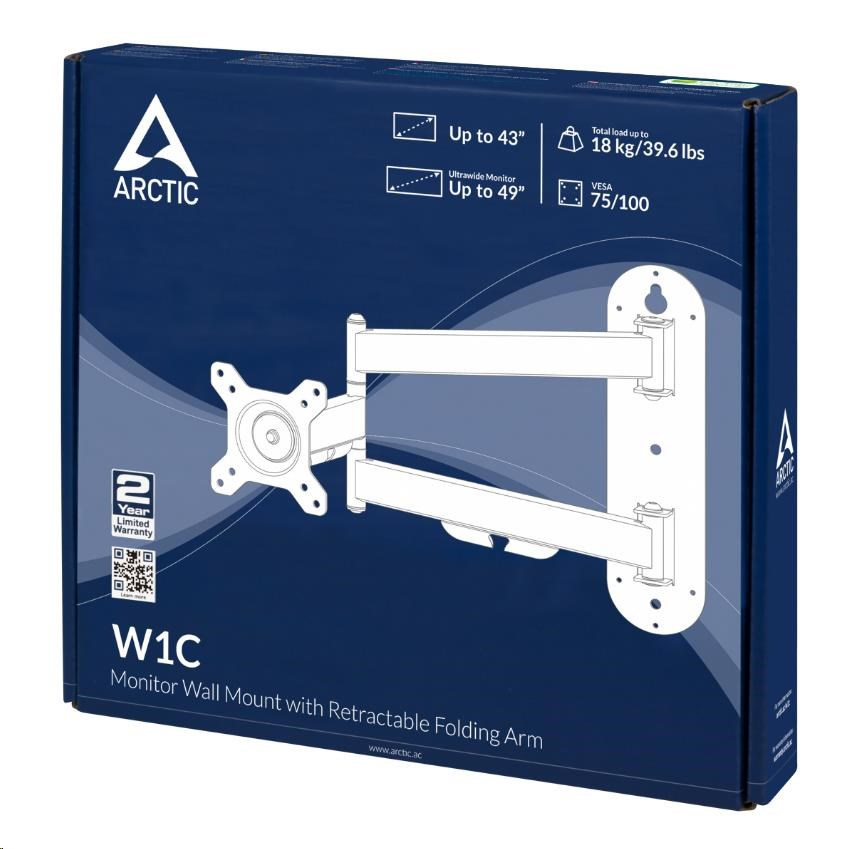 Nástenný držiak na monitor ARCTIC W1C bez problémov podporuje najnovšie ultraširokouhlé monitory (do 49 palcov). Kompatibilné sú aj klasické monitory s pomerom strán 16:9 (do 43 palcov). W1C unesie celkovú záťaž 18 kg/39.6 libier.