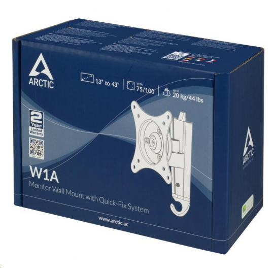 ARCTIC W1A je jednootáčkový držiak s 3-osovým kĺbom, ktorý ponúka plynulé nastavenie uhla obrazovky s 360° rotáciou, 60° otočením a ±15° náklonom. Konštrukcia s guľovým kĺbom poskytuje flexibilitu na dokonalé umiestnenie monitora, aby sa znížilo namáhanie očí, krku, ramien a chrbta. Pripevňuje sa tesne k stene a maximalizuje pracovnú plochu. Dvojdielny systém priamej montáže, ktorý je kompatibilný s monitormi s uhlopriečkou od 13" do 43", umožňuje rýchlu inštaláciu a podporuje hmotnosť až do 20 kg.