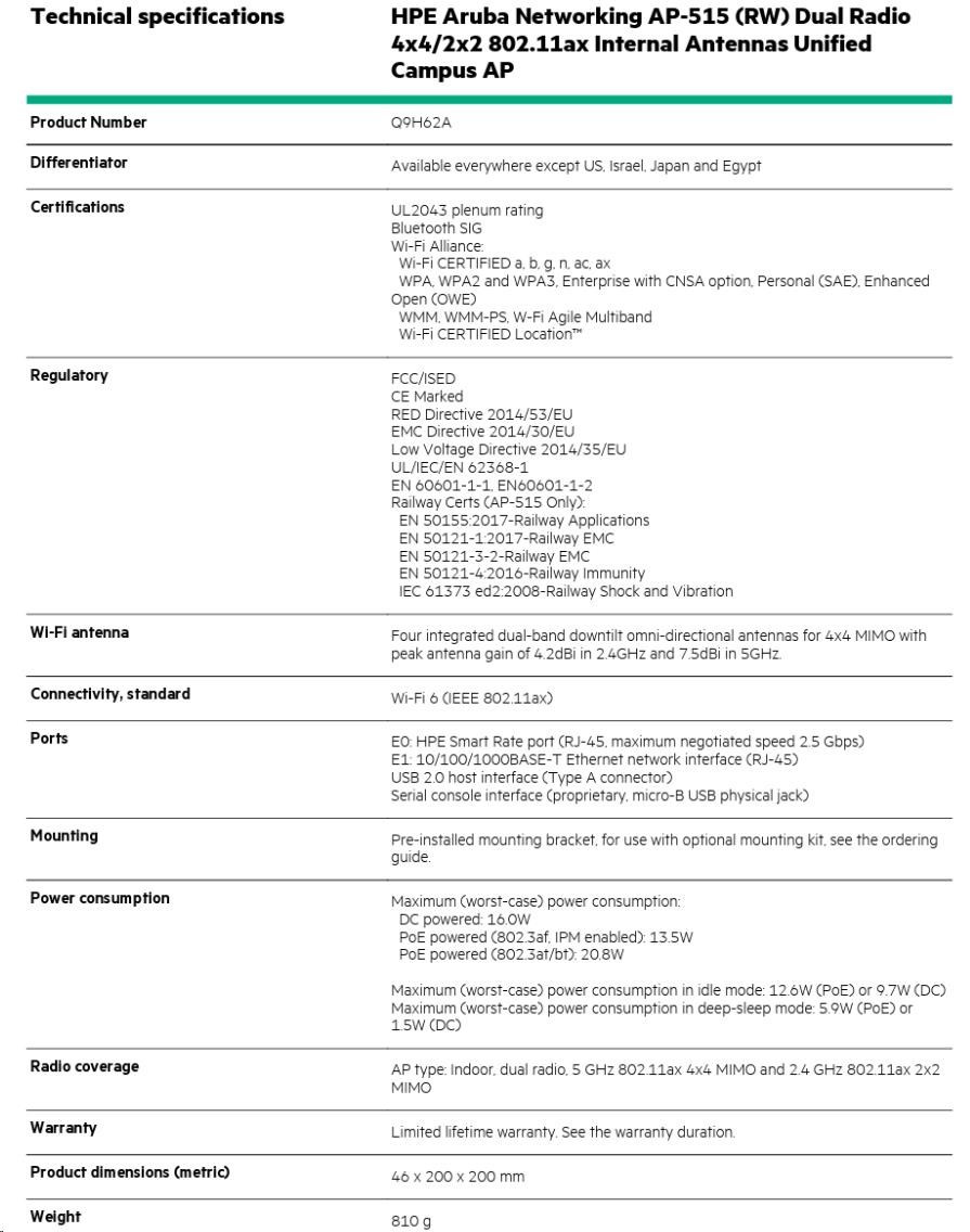 HPE Aruba Networking AP-515 (RW)AP-515 (RW) Dual Radio 4x4:4 + 2x2:2 802.11ax Internal Antennas Unified Campus AP Q9H62A