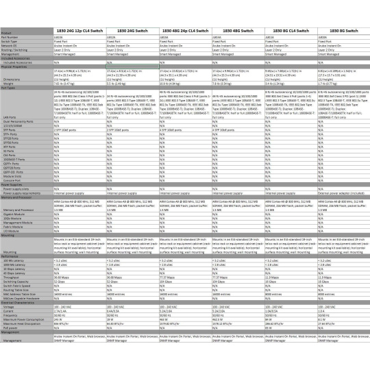| Aruba Instant On 1830 8G Switch (JL810A) | Aruba Instant On 1830 8G 4p Class4 PoE 65W Switch (JL811A) | Aruba Instant On 1830 24G 2SFP Switch (JL812A) | Aruba Instant On 1830 24G 12p Class4 PoE 2SFP 195W Switch (JL813A) | Aruba Instant On 1830 48G 4SFP Switch (JL814A) | Aruba Instant On 1830 48G 24p Class4 PoE 4SFP 370W Switch (JL815A) | ||||