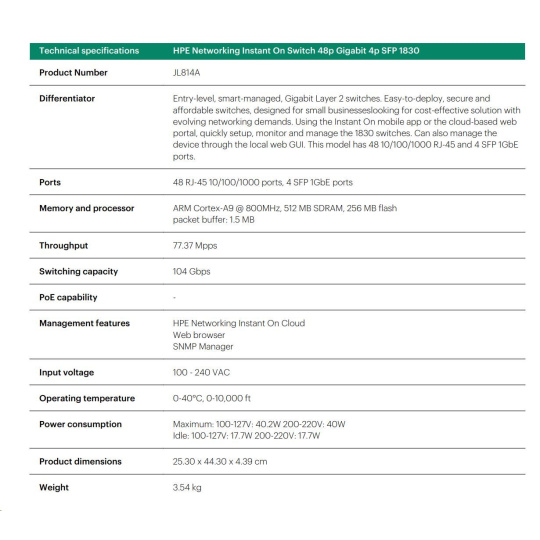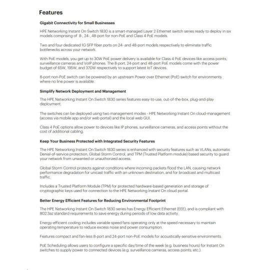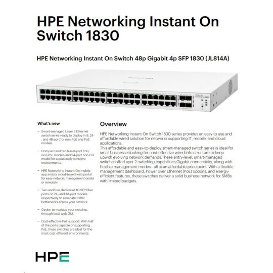 | Aruba Instant On 1830 8G Switch (JL810A) | Aruba Instant On 1830 8G 4p Class4 PoE 65W Switch (JL811A) | Aruba Instant On 1830 24G 2SFP Switch (JL812A) | Aruba Instant On 1830 24G 12p Class4 PoE 2SFP 195W Switch (JL813A) | Aruba Instant On 1830 48G 4SFP Switch (JL814A) | Aruba Instant On 1830 48G 24p Class4 PoE 4SFP 370W Switch (JL815A) | ||||