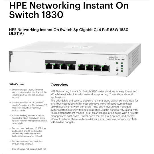 | Aruba Instant On 1830 8G Switch (JL810A) | Aruba Instant On 1830 8G 4p Class4 PoE 65W Switch (JL811A) | Aruba Instant On 1830 24G 2SFP Switch (JL812A) | Aruba Instant On 1830 24G 12p Class4 PoE 2SFP 195W Switch (JL813A) | Aruba Instant On 1830 48G 4SFP Switch (JL814A) | Aruba Instant On 1830 48G 24p Class4 PoE 4SFP 370W Switch (JL815A) | ||||||||