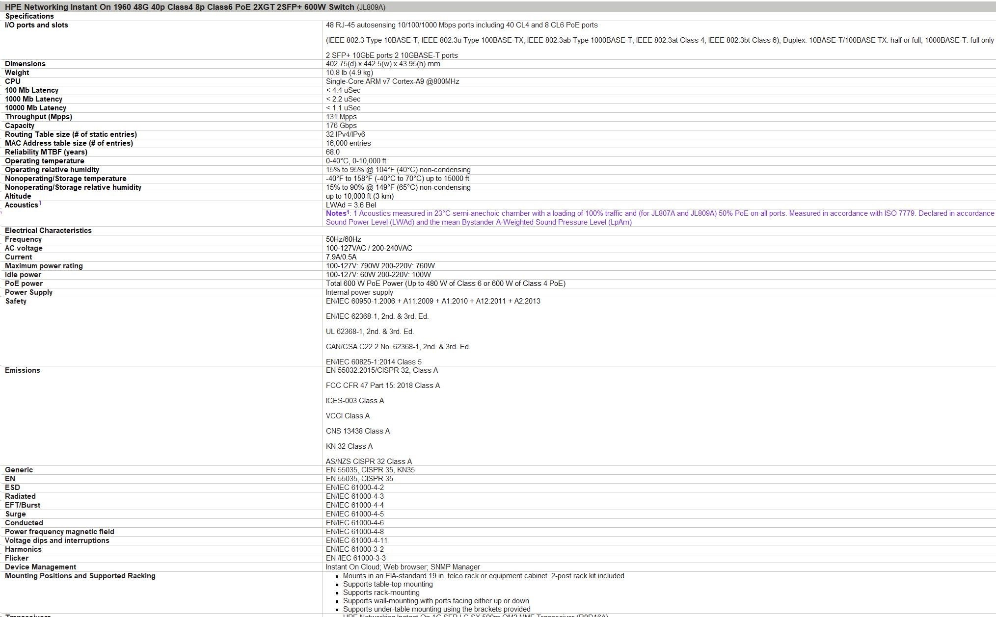 | Notes1: 1 Acoustics measured in 23°C semi-anechoic chamber with a loading of 100% traffic and (for JL807A and JL809A) 50% PoE on all ports. Measured in accordance with ISO 7779. Declared in accordance with ECMA-109:2010. Values presented are the Declared A-Weighted Sound Power Level (LWAd) and the mean Bystander A-Weighted Sound Pressure Level (LpAm) | |