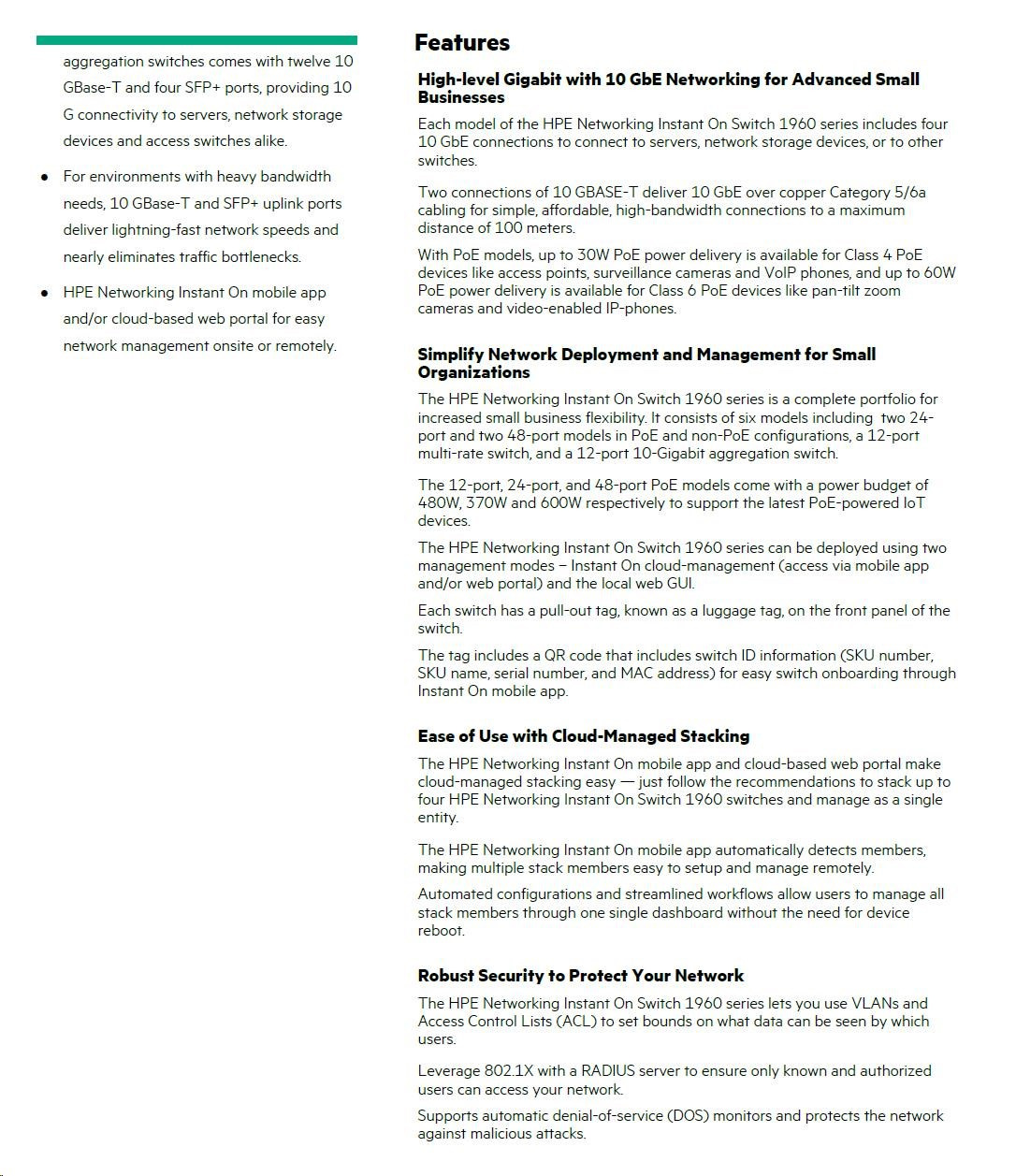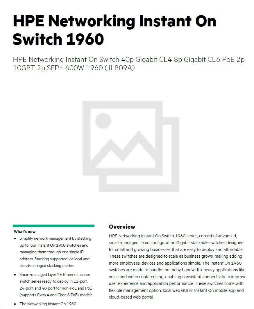HPE Networking Instant On Switch 40p Gigabit CL4 8p Gigabit CL6 PoE 2p 10GBT 2p SFP+ 600W 1960 (JL809A)
