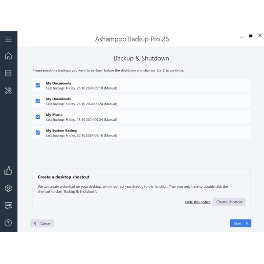 Ashampoo Backup Pro 26 vás zbaví strachu z vírusov, ransomvéru a hardvérových chýb! Vyskúšajte ľahko použiteľné, dobre navrhnuté a zároveň výkonné riešenie zálohovania. Nový Ashampoo Backup Pro vám ponúka všetky možné možnosti ukladania: Zálohujte jednotlivé súbory alebo celé oddiely na lokálne disky alebo u poskytovateľov online úložísk. Zálohovací softvér nemôže byť jednoduchší. Stačí zapojiť úložné zariadenie a môžete začať! Okrem toho je program efektívny z hľadiska zdrojov, neprekáža vám a všetku ťažkú prácu vykonáva na pozadí. Obnovenie záloh je veľmi jednoduché! Ashampoo Backup Pro dokonca prichádza so systémom záchrany pri spustení na obnovenie systému v prípade závažného zlyhania systému!