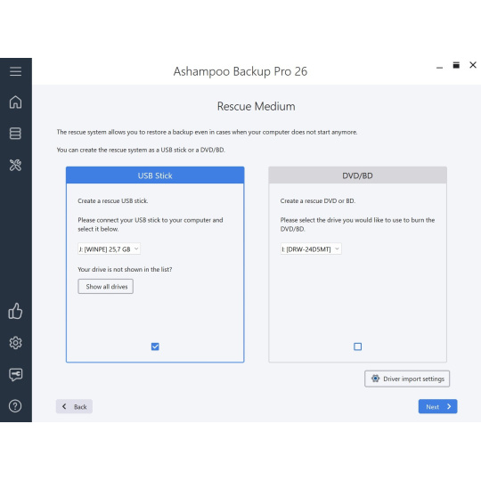Ashampoo Backup Pro vám kryje chrbát, keď dôjde k zlyhaniu systému: Náš najmodernejší záchranný systém založený na systéme Windows dokáže reštartovať váš počítač z DVD alebo USB disku. Namiesto úplnej preinštalácie systému Windows môžete jednoducho obnoviť predchádzajúcu zálohu systému a vrátiť počítač do normálneho stavu. Ušetrite čas a námahu a udržujte svoj počítač a svoje súbory v bezpečí s Ashampoo Backup Pro!