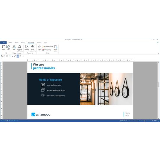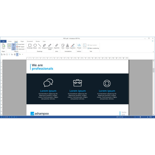 Ashampoo PDF Pro 5 je kompletní řešení pro správu a úpravu vašich PDF dokumentů. Program obsahuje vše, co potřebujete k vytváření, převodu, úpravám, slučování a ochraně vašich PDF souborů. Vytvářejte dokumenty perfektní velikosti, které jsou čitelné na jakémkoli zařízení, a v případě potřeby používejte šifrování k ochraně vašeho majetku. Vaše PDF soubory jsou nyní stejně snadno upravitelné jako dokumenty Wordu!