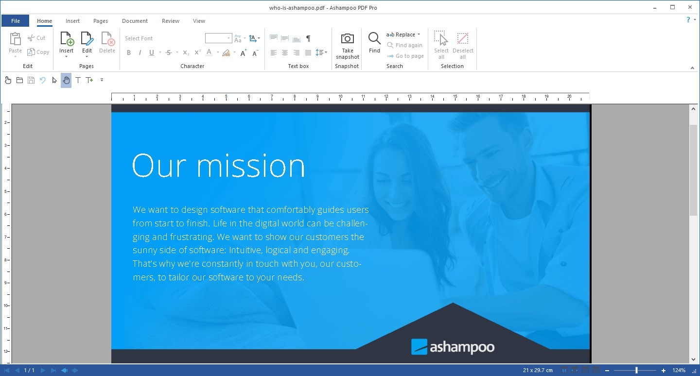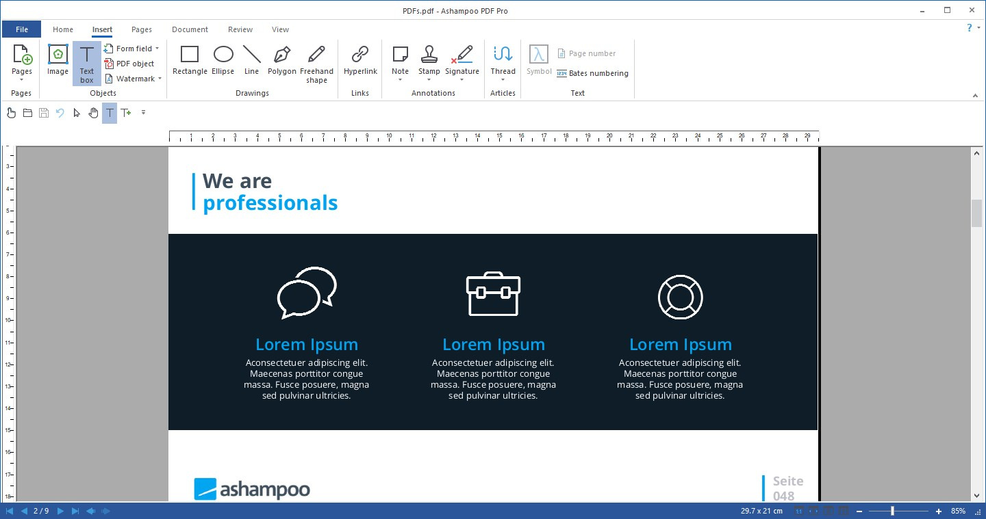 Ashampoo PDF Pro 5 je kompletní řešení pro správu a úpravu vašich PDF dokumentů. Program obsahuje vše, co potřebujete k vytváření, převodu, úpravám, slučování a ochraně vašich PDF souborů. Vytvářejte dokumenty perfektní velikosti, které jsou čitelné na jakémkoli zařízení, a v případě potřeby používejte šifrování k ochraně vašeho majetku. Vaše PDF soubory jsou nyní stejně snadno upravitelné jako dokumenty Wordu!