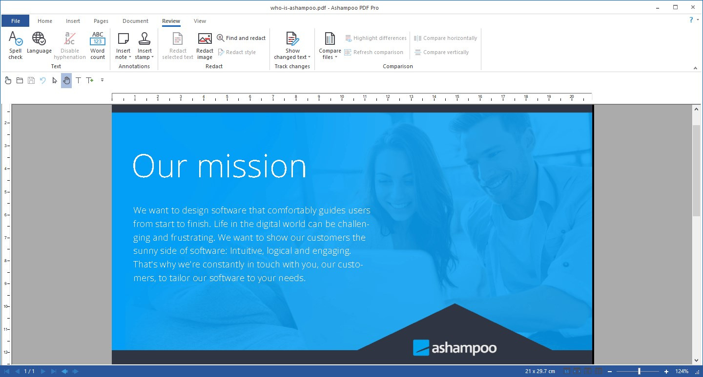 Pracujte chytřeji a šetřete kliknutí s inteligentními funkcemiAshampoo PDF Pro 5 předvídá vaše potřeby a poskytuje znatelné pohodlí při každodenním používání. Když otevřete PDF soubor z Průzkumníka Windows, zobrazí se nyní jako nová karta ve vašem stávajícím okně. Nové zobrazení Rozvržení knihy zobrazuje dvě stránky vedle sebe, stejně jako skutečná kniha, a posouvání po stránkách umožňuje přesunout se přesně o jednu stránku na jedno otočení kolečka myši. Přetáhněte dva soubory PDF do programu a spusťte okamžité porovnání dokumentů, abyste na první pohled viděli rozdíly. Při přidávání textu si Ashampoo PDF Pro 5 pamatuje naposledy použité písmo a velikost, čímž zajišťuje konzistentní vzhled bez nutnosti ručního upravování.
