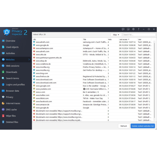 Niekedy sa stane, že musíte zopakovať svoje posledné aktivity na internete. Ako ste sa dostali na stránku a čo ste hľadali? Ashampoo Privacy Inspector vám pomôže analyzovať webové relácie pomocou rozsiahlych zoznamov alebo stromových zobrazení, ktoré zahŕňajú všetky vaše online aktivity. Prežite znova svoju históriu prehliadania webu a už nikdy nestratíte žiadne vlákno.