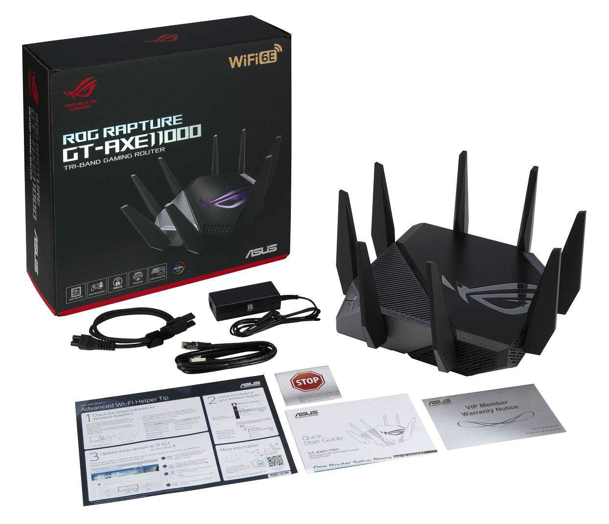 ROG Rapture GT-AXE11000 Trojpásmový herný router GT-AXE11000 WiFi 6E (802.11ax), nové pásmo 6 GHz, 2.port 5G WAN/LAN, kompatibilita s PS5, agregácia WAN, VPN Fusion, trojúrovňová akcelerácia hier, bezplatné zabezpečenie siete a podpora AiMesh Štandard WiFi novej generácie - prvý trojpásmový router WiFi 6E na svete zvyšuje rýchlosť až na 11 000 Mb/s. Nové pásmo 6 GHz - širšie kanály a vyššia kapacita prinášajú vyšší výkon, nižšiu latenciu a menej rušenia. 2.5G WAN/LAN Port - Všetka sieťová prevádzka prechádzajúca cez 2.port 5G má najvyššiu prioritu a 2.port 5G tak môže naplno využiť potenciál WiFi 6. Výkon vďaka špičkovej technológii - štvorjadrový procesor, pokročilý systém chladenia a optimalizovaný dizajn antény posúvajú výpočtové možnosti na úplne novú úroveň. Trojúrovňová akcelerácia hry - zrýchlenie herných dát na každej zastávke od zariadenia až po herný server. RJ45 pre Gigabits BaseT pre WAN x 1, RJ45 pre Gigabits BaseT pre LAN x 4, RJ45 pre 2.5G BaseT pre WAN/LAN x 1 ROG Rapture Wifi 6 802.11ax Trojpásmový gigabitový herný router Wifi 6 802.11ax 1148Mbps (2.4G) Wifi 6 802.11ax 4804Mbps (5GHz) Wifi 6E 802.11ax 4804Mbps (6GHz) OFDMA + MU-MIMO, 1024 QAM, trojúrovňová akcelerácia hier, osvetlenie Aura RGB, ROG Boost Key, 2.5G Multi-Gigabit Gaming Port, WiFI Radar a Zero Wait DFS, AiProtection Pro, VPN Fusion Adaptive QoS, Bandwidth control, AiMesh, ASUS Roter APP (ROG theme)..