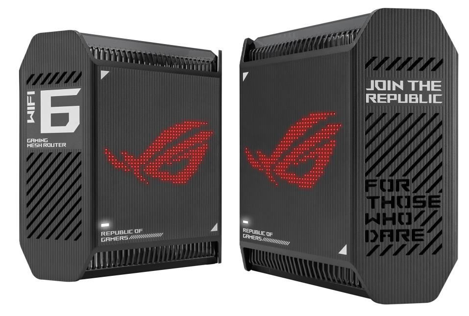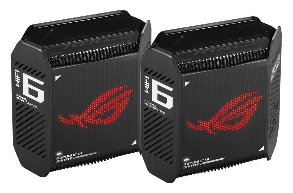 ROG Rapture Wifi 6 802.11ax Tri-band Gigabit Gaming Mesh System Wifi 6 802.11ax 574Mbps (2.4G) Wifi 6 802.11ax 4804Mbps (5GHz-1) Wifi 6 802.11ax 4804Mbps (5GHz-2) Data rate: 10000Mbps Whole home mesh wifi system for large and multi-story homes Supports flexible SSID setting, wired inter-router connections OFDMA + MU-MIMO tech, 1024 QAM, 2.5G WAN port, Triple level Game Acceleration, Aura RGB lighting, AiProtection Pro, VPN Fusion, Instand Guard Adaptive QoS, Bandwidth control, AiMesh, ASUS Roter APP (ROG theme).