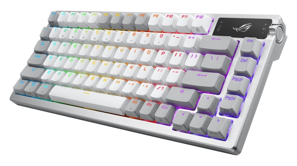 Zakázková herná klávesnica ROG Azoth s tvarovým faktorom klávesnice 75, tesnením, trojvrstvou tlmiacou penou a kovovým horným krytom, vysoko prispôsobiteľná s predom namazanými mechanickými spínačmi ROG NX vymeniteľnými za chodu, stabilizátory klávesnice ROG, kryty kláves PBT doubleshot a mazacou sadou, tri režimy pripojenia s technológiou SpeedNova na 2,4 GHz, OLED displejom, trojcestným ovládacím gombíkom, tromi uhlami náklonu a podporou Mac