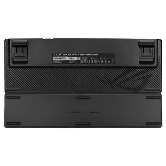 Bezdrôtová herná klávesnica ROG Strix Scope II 96 s pripojením v troch režimoch, klávesové skratky pre streamovanie, multifunkčné ovládacie prvky, mechanické spínače ROG NX s možnosťou výmeny za chodu, stabilizátory klávesnice ROG, krytky kláves PBT doubleshot a silikónová tlmiaca pena, tri uhly sklonu a opierka zápästia