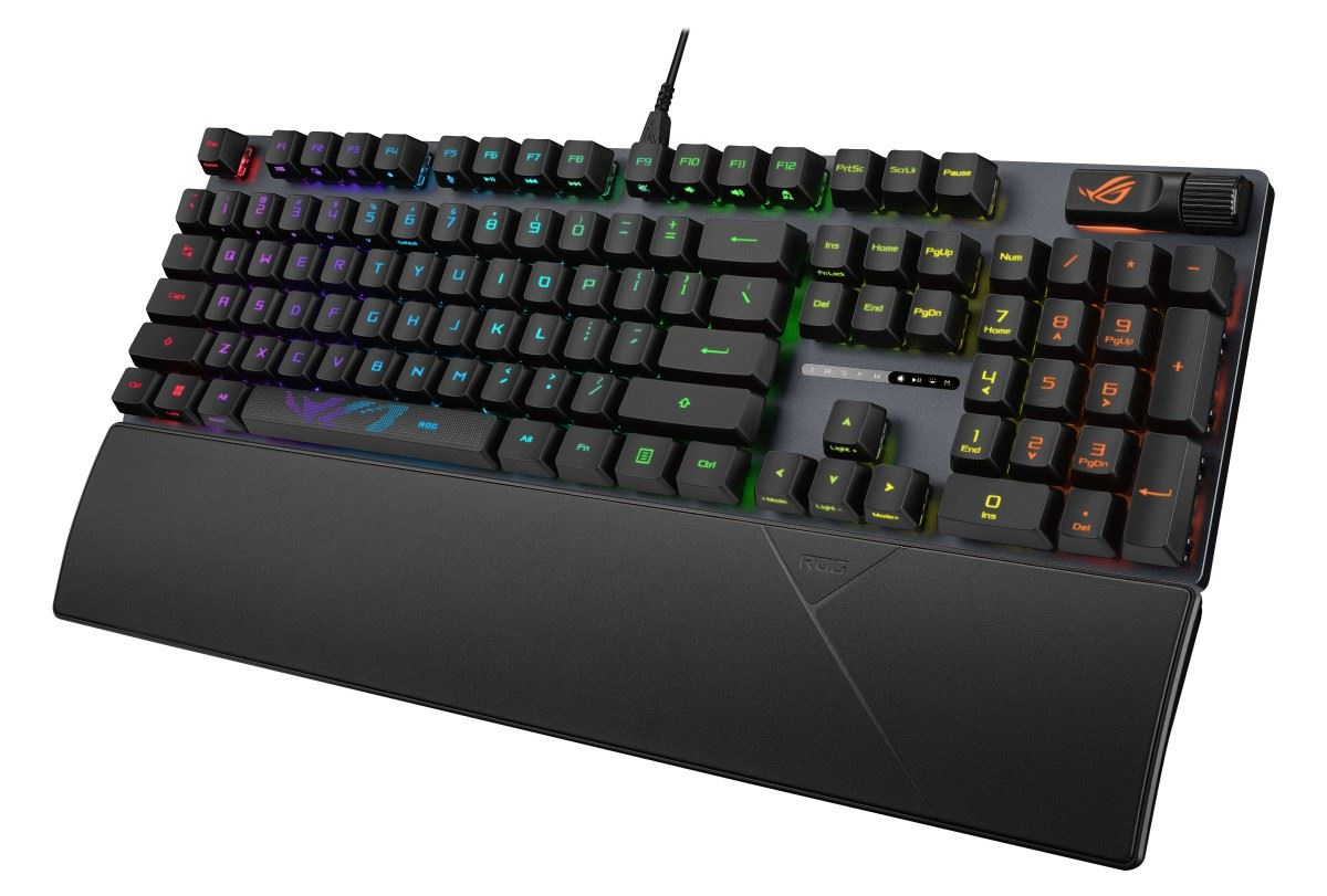 Herná klávesnica ROG Strix Scope II s predpripravenými mechanickými spínačmi ROG NX Red, penou na tlmenie hluku, dvojitými krytkami kláves PBT alebo ABS s UV povrchovou úpravou, klávesovými skratkami na streamovanie, multifunkčnými ovládacími prvkami, tromi uhlami sklonu a opierkou zápästia