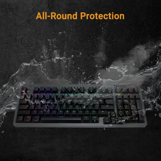 Klávesnica ASUS TUF Gaming K3 Gen II s kompaktným rozložením 97 kláves, opticko-mechanickými RGB prepínačmi, silikonovým tesnením, tlmiacou penou, vodotesnosťou IP57, odnímateľnou hornou doskou a kompatibilitou Aura Sync.