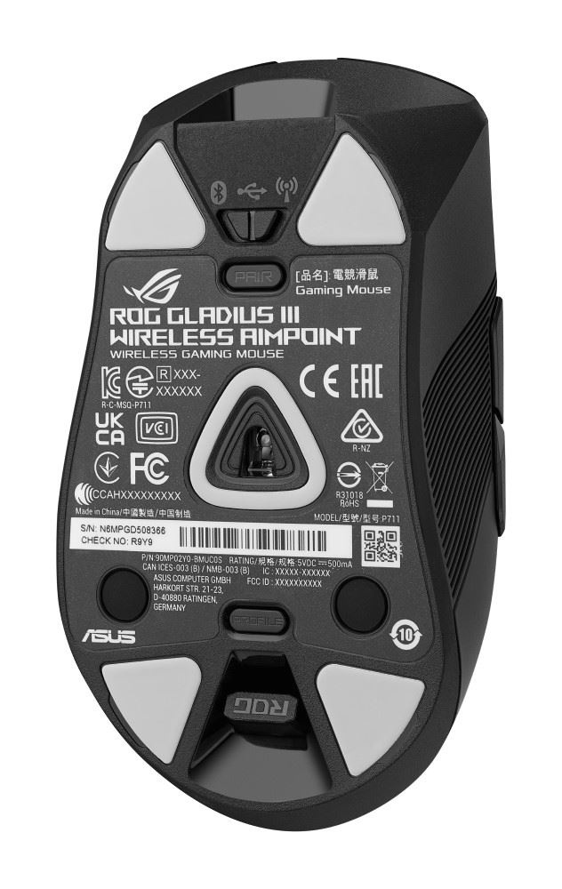 - Push-Fit Switch Socket II: Vymeniteľný dizajn spínača pre jednoduché prispôsobenie; Gladius III Wireless AimPoint obsahuje mikrospínače ROG a je kompatibilný s ďalšími 3pinovými mechanickými a 5pinovými optickými mikrospínačmi