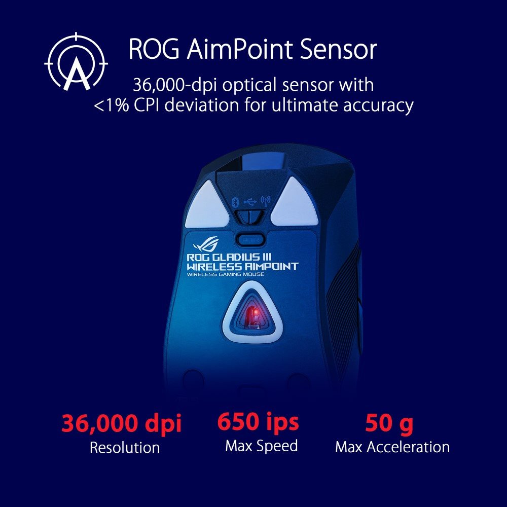 ROG Gladius III Wireless AimPoint je ľahká 79gramová bezdrôtová herná myš RGB, ktorá je vybavená optickým senzorom ROG AimPoint s rozlíšením 36 000 dpi, konektivitou v troch režimoch, bezdrôtovou technológiou ROG SpeedNova, vymeniteľnými spínačmi myši, mikrospínačmi ROG, mechanizmom otočných tlačidiel pre 0 Latency kliknutia ms, ergonomickým dizajnom, ROG Paracord, nožičkami myši zo 100% PTFE, šiestimi programovateľnými tlačidlami a páskou na uchopenie myši.