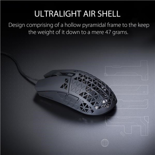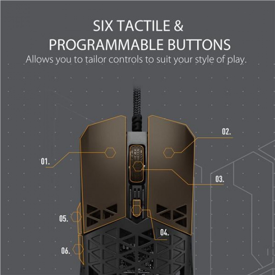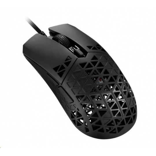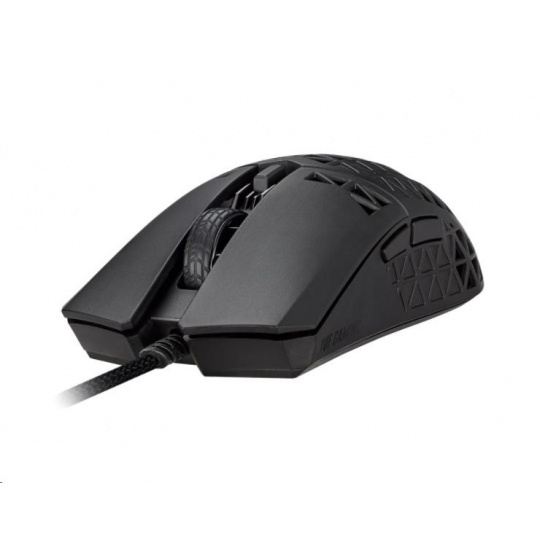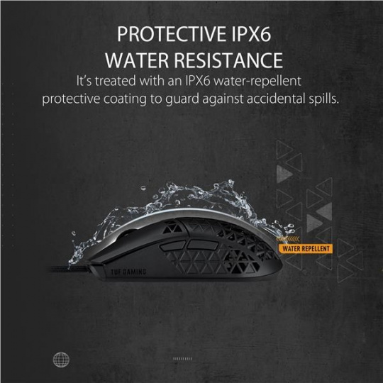 Ľahká drôtová herná myš so snímačom s rozlíšením 16 000 dpi, šiestimi programovateľnými tlačidlami, ultraľahkým plášťom Air Shell, odolnosťou voči vode IPX6, antibakteriálnou ochranou ASUS, šnúrkou TUF Gaming Paracord a čistými PTFE nožičkami