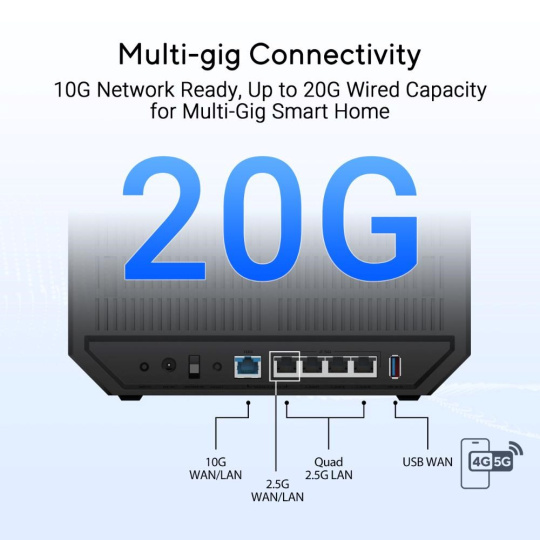 | I/O porty | 1x 10Gbps WAN/LAN port 1x 2.5Gbps WAN/LAN port 3x 2.5Gbps LAN port 1x USB 3.2 |