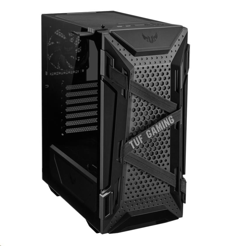 Kompaktná skrinka ASUS TUF Gaming GT301 ATX typu mid-tower s bočným panelom z tvrdeného skla, predným panelom voštinového typu, 120 mm ventilátorom AURA Addressable RGB, závesom na slúchadlá a 360 mm radiátorom.