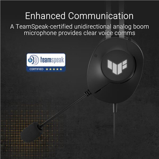 Káblová herná náhlavná súprava s 40mm meničmi ASUS Essence, virtuálny 7.1 priestorový zvuk, mikrofón s certifikáciou TeamSpeak, ľahká konštrukcia vážiaca 297 gramov, odolné náušníky a podsvietenie symbolického loga TUF