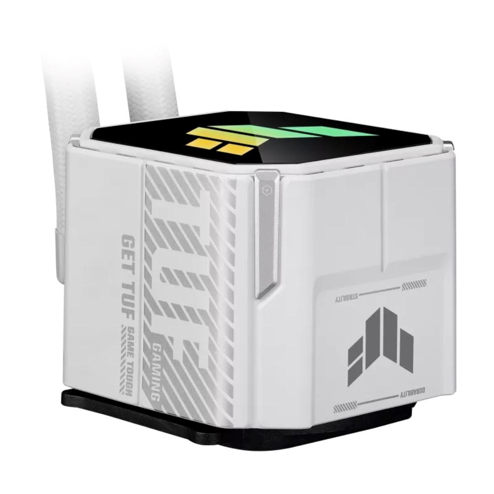TUF Gaming LC III 360 ARGB White Edition všetko v jednom vodný chladič CPU s predinštalovanými a integrovanými trojitými ventilátormi navrhnutými pre vysoký prietok vzduchu a statický tlak; účinné čerpadlo na zabezpečenie optimálnej prevádzkovej teploty CPU.