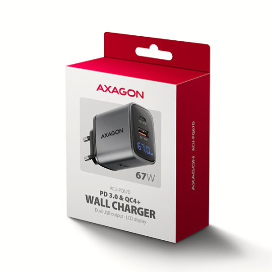 AXAGON ACU-PQ67D, GaN nabíjačka do siete 67W, výstup USB-A + USB-C, PD3.0/PPS/QC4+/SFC2.0/Apple, LCD display