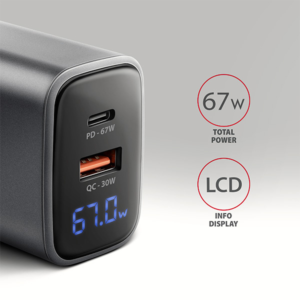 AXAGON ACU-PQ67D, GaN nabíjačka do siete 67W, výstup USB-A + USB-C, PD3.0/PPS/QC4+/SFC2.0/Apple, LCD display