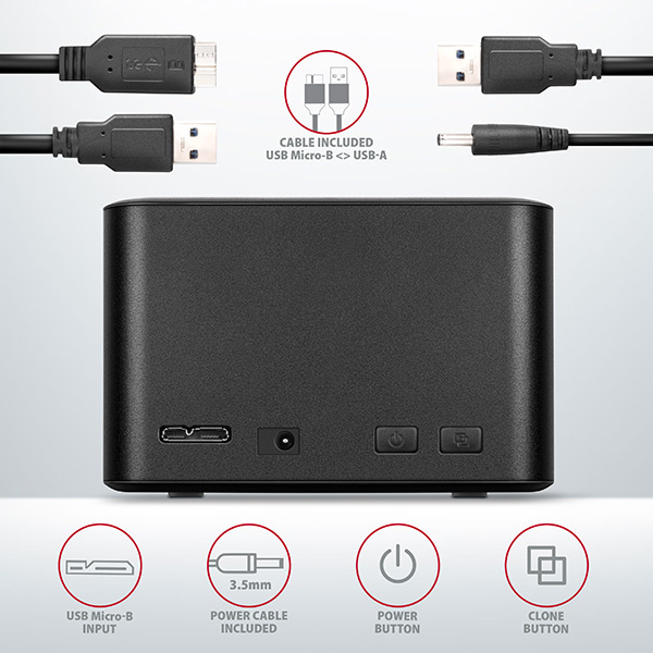 Dokovacia/klonovacia stanica AXAGON ADSA-D25 CLONE MINISuperSpeed USB 5 Gb/s ľahko a rýchlo pripojí až dva 2.5" disky súčasne. Konektor USB Micro-B na doku spolu s dodaným káblom USB Micro-B <-> USB-A umožňuje pripojenie k počítaču.
