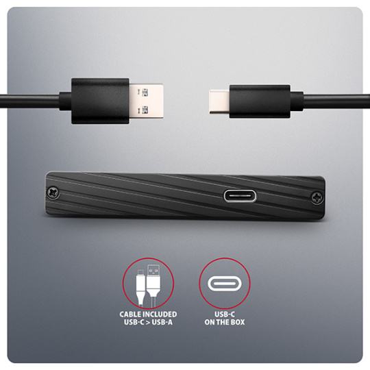 Kompaktný hliníkový externý AXAGON EE25-XA6C ALINE box s USB-C 5Gbps rozhraním určený pre 2.5" SATA pevné disky alebo SSD. Spoľahlivé pripojenie k počítaču umožňuje obojstranný USB-C konektor na boxe spolu s dodávaným káblom USB-C -> USB-A.