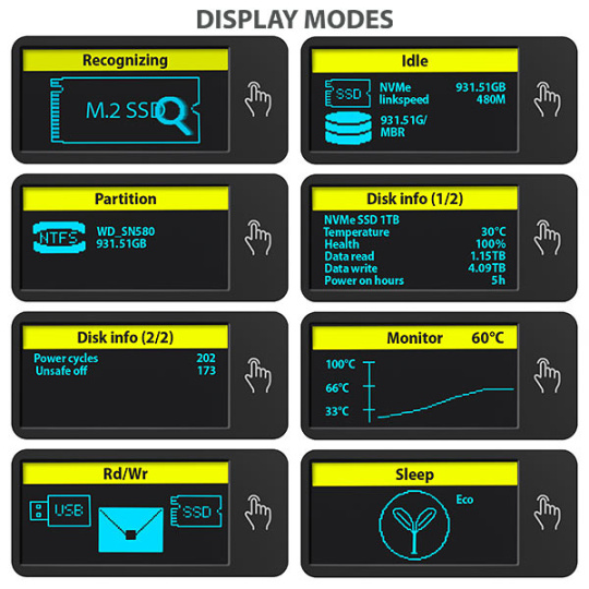 Box je vybavený pokročilým LED displejom, ktorý poskytuje okamžitý prehľad o stave vášho disku. Ponúka niekoľko režimov zobrazenia, vrátane detekcie pripojeného disku, použitého systémového súboru, teploty, zdravia disku, rýchlosti prenosu dát a pracovných hodín. Podrobný graf umožňuje sledovanie teploty disku v reálnom čase, zatiaľ čo režim spánku šetrí energiu pri nečinnosti. S týmto inteligentným monitoringom budete mať svoj disk vždy pod kontrolou - jednoducho, prehľadne a efektívne.