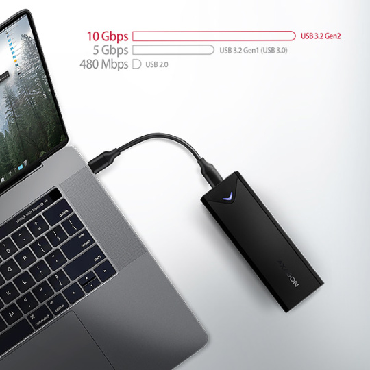Vďaka rozhraniu USB 3.2 Gen 2 je prenosová rýchlosť až 10 Gb/s. Externý M.2 box podporuje aj ďalšie moderné funkcie ako UASP, TRIM a umožňuje čítať S.M.A.R.T. informácie monitorujúce stav disku. Podporuje režim úspory energie pri nečinnosti.
