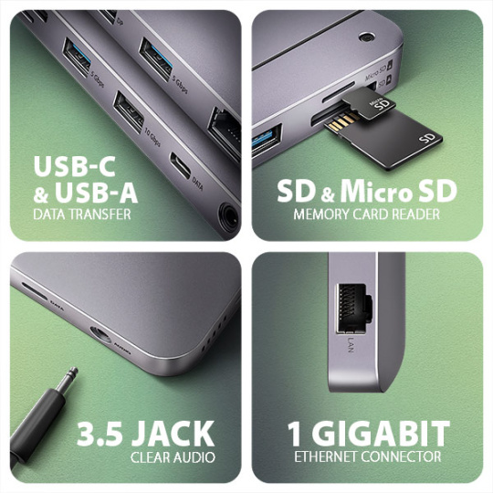 AXAGON HMC-12GM2 GEN2COMBO 12v1 USB-C 10Gbps multiportový hub rozšíri váš notebook, počítač alebo telefón o jedenásť portov a externý box pre M.2 disk. Prostredníctvom obojstranného USB-C konektora ľahko a rýchlo pripojíte k počítaču až dva monitory, štyri USB zariadenia, gigabitovú ethernetovú sieť, slúchadlá, čítačku SD kariet a NVMe alebo SATA M.2 SSD disk. Zároveň získate možnosť napájania notebooku pomocou technológie Power Delivery. Rozbočovač USB-C vám poskytne jednoduchú a kompaktnú dokovaciu stanicu 12 v 1 pre notebook, ako je napríklad Apple MacBook Air alebo Pro.
