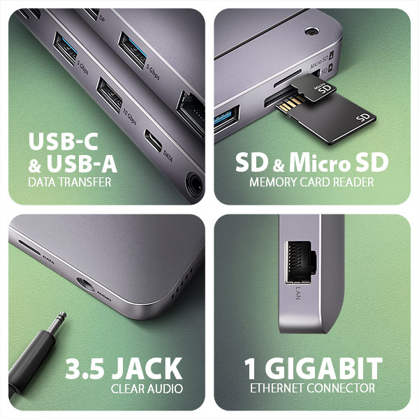 Elegantné hliníkové telo zaisťuje nielen mechanickú odolnosť, ale aj pasívne chladenie. O aktívne chladenie sa stará tichý integrovaný ventilátor, ktorý chladí pohon M.2 aj samotné telo náboja. Poteší vás aj jemne štruktúrovaný povrch, na ktorom nezostávajú odtlačky prstov. Replikátor portov je ideálnym doplnkom pre notebooky s nedostatkom USB konektorov, pamäte alebo video výstupov. Kábel USB-C s dĺžkou 50 cm je odnímateľný a v prípade potreby ho možno nahradiť dlhším káblom.