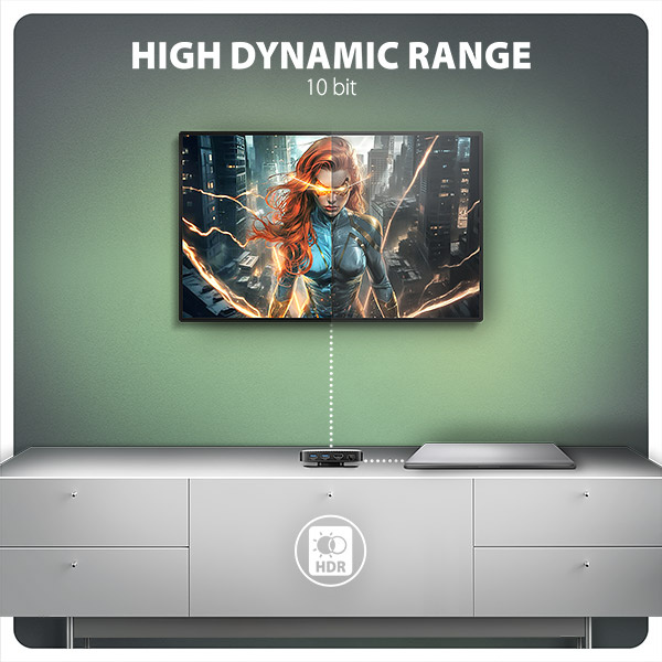HDMI výstup umožňuje pripojiť externý monitor, televízor alebo projektor s rozlíšením až 4K/60Hz Ultra HD, 2K/144Hz Quad HD alebo 1080p/240Hz Full HD a prenášať viackanálový zvuk. Vďaka podpore HDR si môžete vychutnať výrazne rozšírenú škálu farieb a kontrastov.