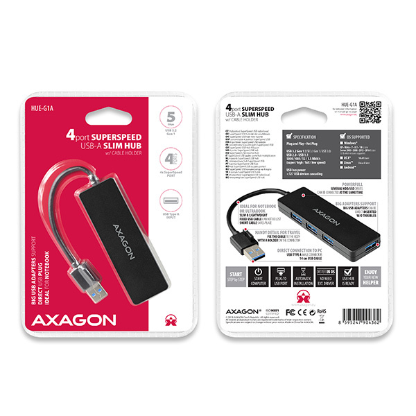 4-portový USB 3.2 Gen 1 hub AXAGON HUE-G1A je malý a tenký rozbočovač vhodný nielen na cesty. Elegantné plastové telo s polo-matným, jemne štruktúrovaným povrchom, na ktorom nezostávajú odtlačky. Ľahko a rýchlo pripojí k laptopu alebo počítaču až štyri USB zariadení súčasne.