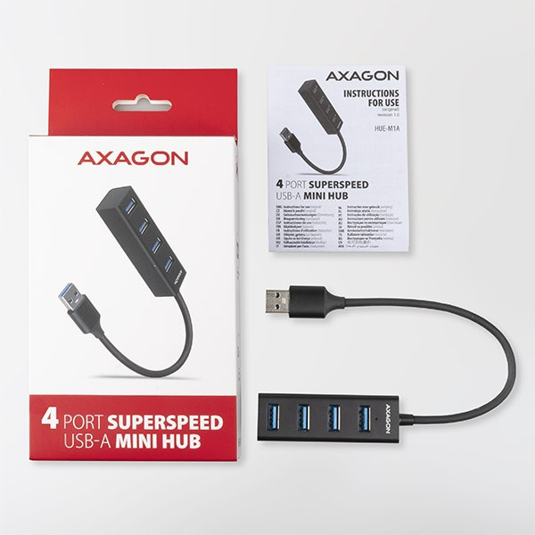 Miniatúrne kovové USB 3.2 Gen 1 (USB 3.0) Rozbočovač AXAGON HUE-M1A ľahko a rýchlo pripojí k notebooku alebo počítaču až štyri zariadenia USB súčasne. Kovové telo rozbočovača je vyrobené z hliníka a poskytuje dokonalú mechanickú ochranu pri častom prenášaní. Elegantný, jemne štruktúrovaný povrch zabraňuje nechceným odtlačkom prstov. Gumové nožičky zabraňujú kĺzaniu hubky po stole. 20 cm dlhý pevný kábel USB je ideálny pre používateľov mobilných zariadení.