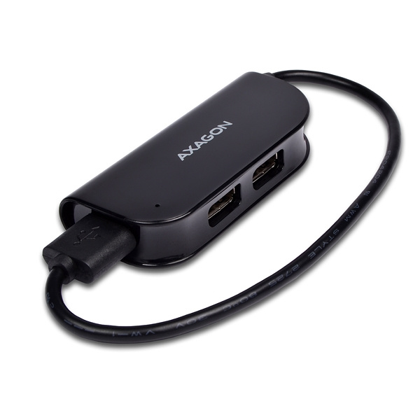 Štyri porty USB 2.0 READY hub AXAGO HUE-X4B s pevným káblom USB.