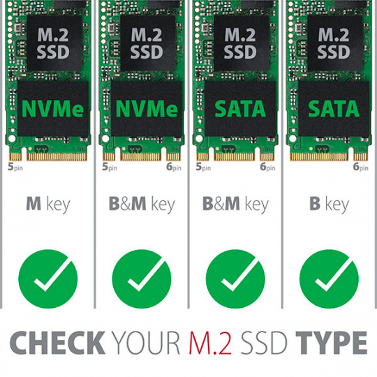 Adaptér podporuje použitie SATA i NVMe (PCI-Express) M.2 SSD diskov, jednostranných i obojstranných. Redukcia nemá obmedzenia kapacity SSD diskov a možno použiť M.2 karty všetkých rozmerov až do dĺžky 110 mm. Samozrejmosťou je fungovanie oboch diskov zároveň.