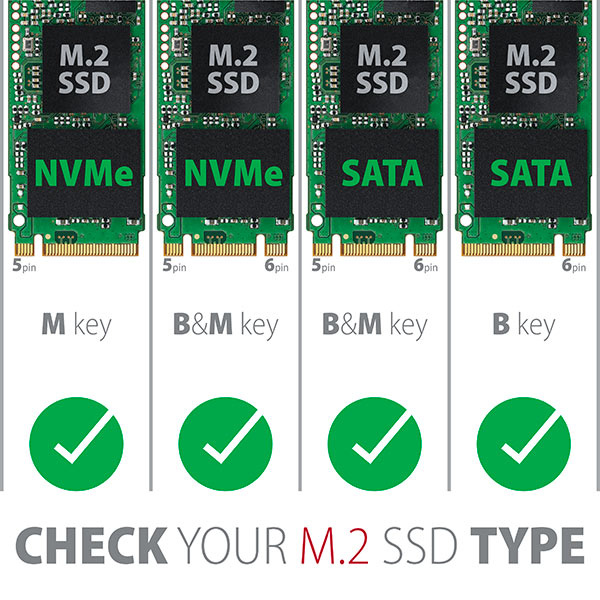 Adaptér podporuje použitie SATA i NVMe (PCI-Express) M.2 SSD diskov, jednostranných i obojstranných. Redukcia nemá obmedzenia kapacity SSD diskov a možno použiť M.2 karty všetkých rozmerov až do dĺžky 110 mm. Samozrejmosťou je fungovanie oboch diskov zároveň.
