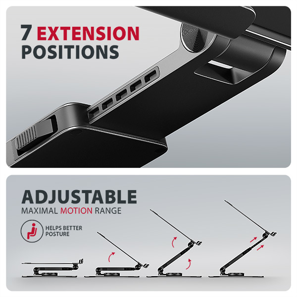 Unikátní funkcí je výsuvné rameno s pojistkou proti uvolnění, které umožňuje jeho prodloužení až o 6 cm díky sedmi nastavitelným pozicím. Tímto způsobem snadno nastavíte notebook do optimální výšky a vzdálenosti od vašich očí přesně podle vašich potřeb. Chytré řešení s dvojitým kloubem poskytuje plynulé nastavení výšky obrazovky tak, aby byla v jedné rovině s vaším externím monitorem. Tím získáte další pracovní plochu ve správné úrovni očí, což výrazně zlepšuje ergonomii, zvyšuje pohodlí a zároveň podporuje vaši produktivitu.