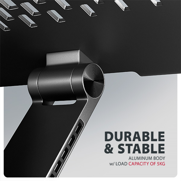 Podstavec pro notebook je vyroben z robustních hliníkových odlitků garantujících dlouhou životnost a spolehlivost. Díky protiskluzové úpravě zůstane vaše zařízení bezpečně na svém místě bez rizika nechtěných pohybů, aniž by došlo k jakémukoliv poškození povrchu notebooku nebo podložky. Tyto pečlivě navržené vlastnosti zaručují perfektní stabilitu pro váš notebook, tablet nebo oblíbenou knihu, což vám poskytne klid a pohodlí při každodenním používání.